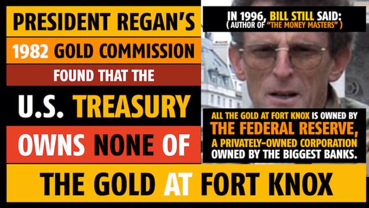 In 1982, President Regan’s “Gold Commission” found that the U.S. Treasury owns none of the gold at Fort Knox. All of the gold at Fort Knox is owned by the Federal Reserve, a privately-owned corporation, owned by the biggest banks. This was noted in 1996 by Bill Still, author of “The Money Masters: How International Bankers Gained Control of America”. (The Federal Reserve — “The Fed” — is NOT federal. It is privately owned.)
