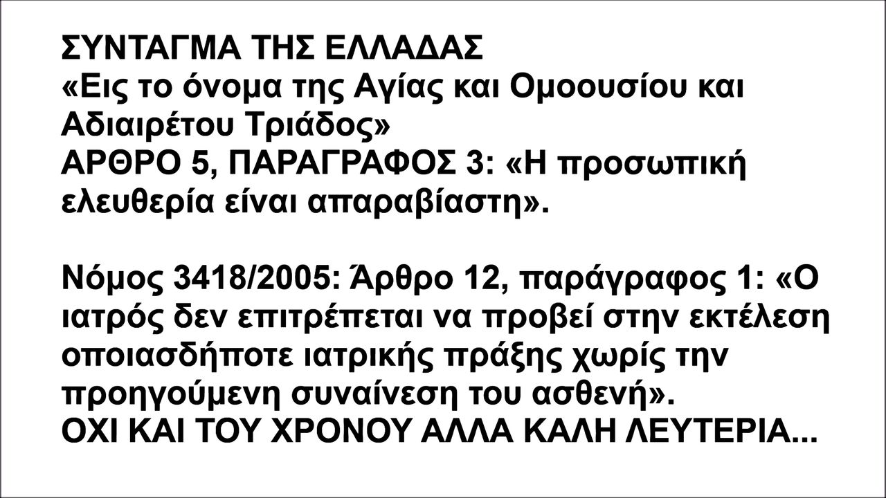 ΑΡΘΡΟ 5, ΠΑΡΑΓΡΑΦΟΣ 3: «Η προσωπική ελευθερία είναι απαραβίαστη» https://www.hellenicparliament.gr/UserFiles/8c3e9046-78fb-48f4-bd82-bbba28ca1ef5/SYNTAGMA1_1.pdf . (ΑΣ ΜΕΛΕΤΗΣΟΥΜΕ ΤΟ ΣΥΝΤΑΓΜΑ ΓΙΑ ΝΑ ΔΙΑΠΙΣΤΩΣΟΥΜΕ ΟΤΙ ΔΕΝ ΥΠΑΡΧΕΙ ΑΡΘΡΟ ΤΟΥ ΠΟΥ ΝΑ ΜΗΝ ΚΑΤΑΠΑΤΟΥΝ ΟΙ ΠΑΡΑΛΟΓΟΙ ΑΝΤΙΧΡΙΣΤΟΙ ΓΕΝΟΚΤΟΝΟΙ ΔΙΚΤΑΤΟΡΙΣΚΟΙ, ΠΡΟΔΡΟΜΟΙ ΤΟΥ ΑΝΤΙΧΡΙΣΤΟΥ).