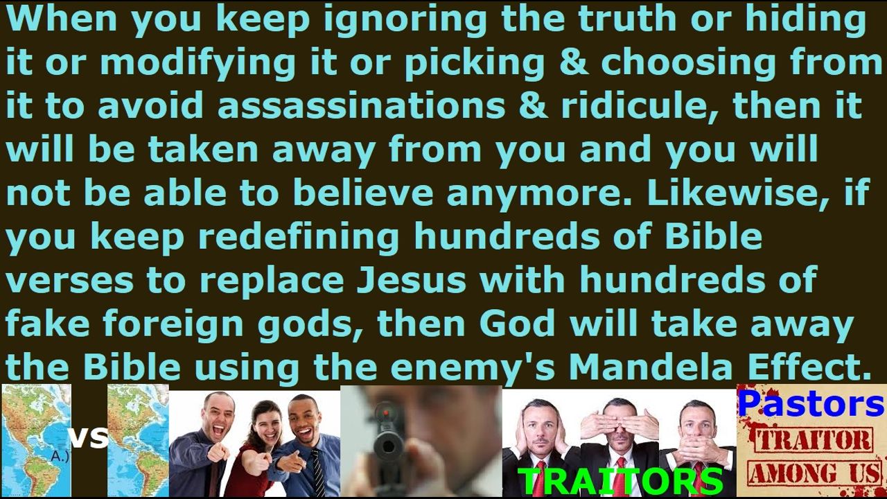 *** Intelligence news update from the Human Homo-Sapiens Race Survival Resistance (HRSR) headquarters and Republic Rebel Alliance battlefront (March 2024). When you keep ignoring the truth or hiding it or modifying it or picking & choosing from it to avoid assassinations & ridicule, then it will be taken away from you and you will not be able to believe anymore. Likewise, if you keep redefining hundreds of Bible verses to replace Jesus with hundreds of fake foreign gods, then God will take away the Bible using the enemy's Mandela Effect. It is not Satan Lucifer and his hell’s army that have removed us real Christians’ websites from Twitter & Facebook & YouTube & Instagram, but it was God who removed us, just like it was not Satan Lucifer and his hell’s army that crucified Jesus, but it was Jesus who placed himself on the cross, in order to give his life for all of humanity so that they may be saved. After decades of sharing the truth every day, the people who remained on Twitter & Facebook & YouTube & Instagram and ignored our warnings lost the truth that they held in contempt. There comes a time when God removes the truth from the evil Western feminist nations’ “naked women’s heads, men’s pants cross-dressers androgynous transgender freaks” most wicked most dumbest most blindest most perverted most “Jezebel demon-possessed” generation in human history, just like in Noah’s days. This is also why the “naked women’s heads, men’s pants cross-dressers androgynous transgender freaks” fake Christians, who continue to ignore God’s truth and God’s warnings and hide all of it from the 6 billion humans because of fear of immediate assassination attempts from their church member witch assassins and ridicule from all their church donators and getting cooked alive by CIA microwave oven weapons from next door homes & every hotel room, have their hearts become more and more callous & hard and they reach a point where they have no ability or room to accept the truth or warnings. You are either going one way or the other, either becoming more faithful & bolder & loving & righteous & holy, or more treacherous & cowardly & selfish & wicked & ungodly, because there is no neutrality middle-ground spiritual-adulterous double-faced world-valued rebellious pseudo-Christianity as Satan Lucifer’s millions of Western feminist nations’ Nicolaitan clergy class laity class Satanist pagan religious system’s “ordained & allowed & trained & non-assassination-attempts-receiving” fake unbiblical job position pastors teach, who are leading millions of church donators to hell. When you hear the truth and condone it in silence, then you are agreeing with it, and you will reap the consequences. Even worse, they even have the audacity to insult God by trying to appease both Satan Lucifer & God by modifying & diluting & sterilizing & picking & choosing & editing the tens of thousands of truths we real Christians shared to them in our daily sermons for decades, in order to make it safe for themselves from assassination attempts and ridicule from church donators, so that they can sabotage God’s truths and destroy our real Christians’ ministries and cover-up Satan Lucifer and mislead millions of people to hell & false realities & false understandings & false complacencies & false political/social solutions. The worst sly conniving fake Christians are those who pretend that they do not have the Holy Spirit's discernment of the truth, in order to use that as an excuse to remain silent to condone all the evils.
