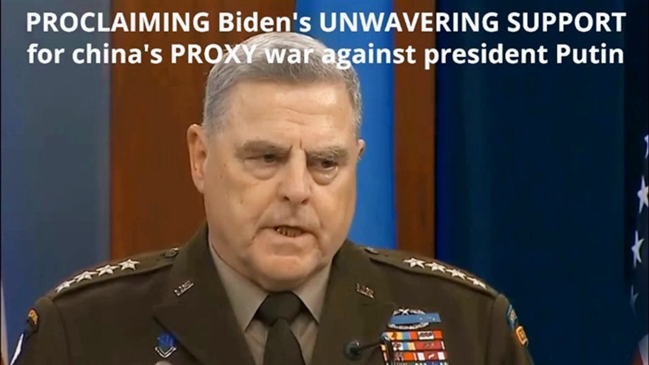 Video text: General Milley - PROCLAIMING BIDEN's UNWAVERING SUPPORT for china's PROXY war against president Putin. The Two Witnesses are AGAINST all STAGED WARS!