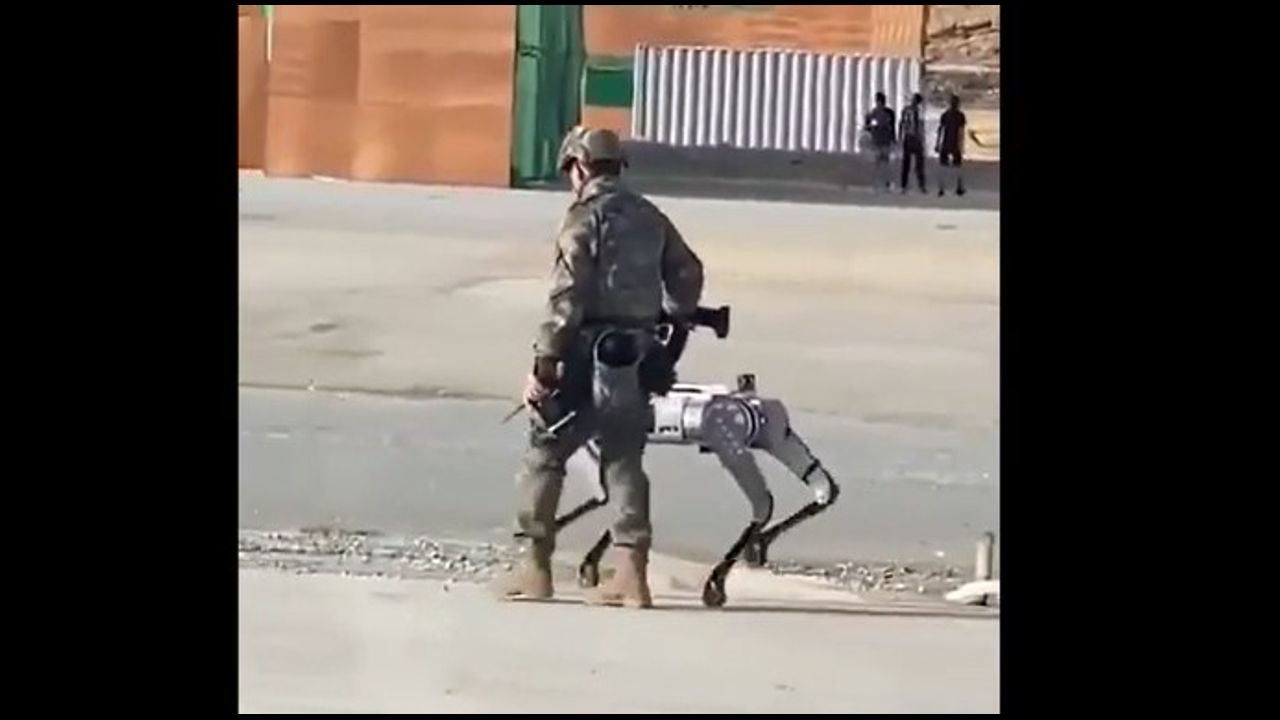 Chinese PLA Soldier Taking His Armed Robot Dog for Walkies