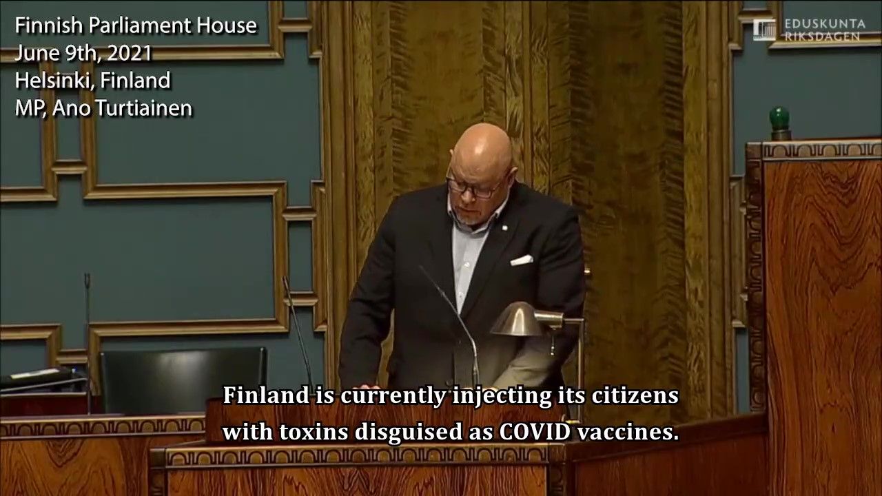 Ano Turtiainen, member of Parliament of Finland, gave a straight speech 9.6.2021 about possible COVID vaccine genocide going on in Finland. He warned all members of the Finnish Parliament and media by letting them know if they would still continue misleading our citizens by telling them fairy tales about safe vaccines, they are intentionally involved in several different crimes, the most serious of these may be even genocide.
