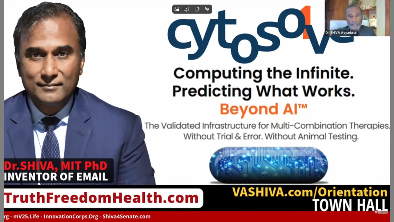 In this presentation, Dr. SHIVA Ayyadurai, MIT PhD, Inventor of Email, and Independent Candidate for President of the United States and U.S. Senate, reveals why CytoSolve is the breakthrough needed to compute what modern medicine refuses to face: the combinatorial explosion of biology—where millions of natural compounds and thousands of drugs create possibilities that dwarf the number of atoms in the observable universe. CytoSolve integrates validated molecular pathway models into executable, system-level simulations to predict efficacy, toxicity, and synergy upfront, replacing blind trial-and-error and exposing a new standard for discovery and development—faster, cheaper, safer, and explainable. Full Blog Post:https://vashiva.com/dr-shiva-live-cyt...