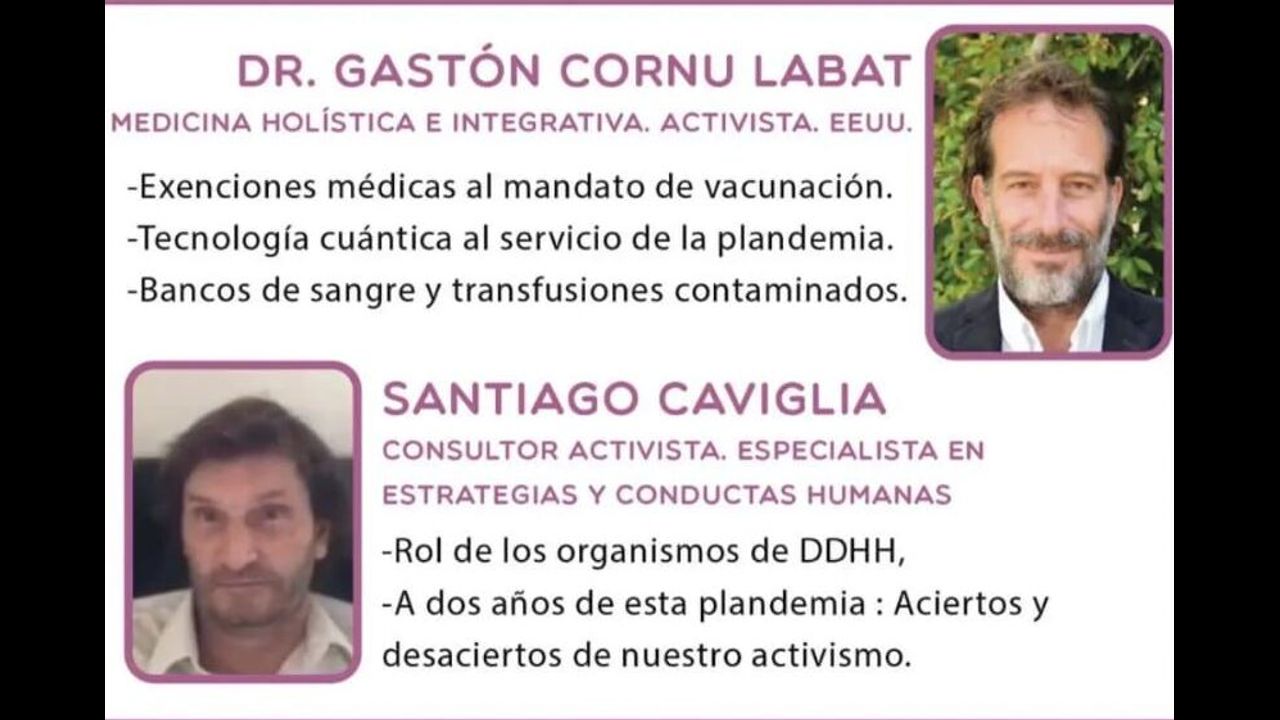 El 24 de marzo –Día Nacional por la Verdad y Justicia- se lleva a cabo un coloquio, una charla abierta entre UNAPSI (Unión Argentina de Profesionales de la Salud Integrativa –María José Molina, nutricionista y Lucia Mas, abogada y acesora de proyectos empresariales-), el doctor Gastón Cornu Labat (médico cirujano y holístico) y el consultor Santiago Caviglia (especialista en estrategias y conductas humanas). Participa también la Señora Cristina Brito, productora de radio y televisión en programas de salud, información e investigación. Todos ellos son activistas profesionales anti agenda globalista de explotación y exterminio.