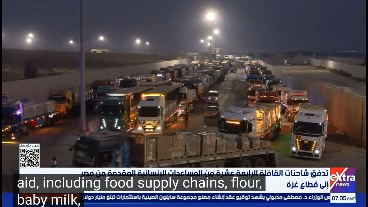 تدفق شاحنات القافلة الرابعة عشرة من المساعدات الإنسانية المقدمة من مصر إلى غزة..مراسلنا يرصد المشهد