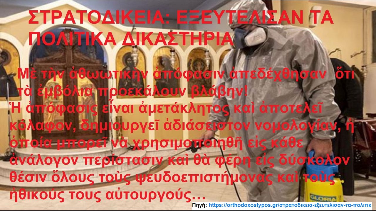 ΣΤΡΑΤΟΔΙΚΕΙΑ: ΕΞΕΥΤΕΛΙΣΑΝ ΤΑ ΠΟΛΙΤΙΚΑ ΔΙΚΑΣΤΗΡΙΑ. Μὲ τὴν ἀθωωτικὴν ἀπόφασιν ἀπεδέχθησαν ὅτι τὰ ἐμβόλια προεκάλουν βλάβην! https://ugetube.com/watch/iEjngukuKcKIw9a , https://rumble.com/v5hh385-military-courts-accepted-that-vaccines-cause-harm.html .
