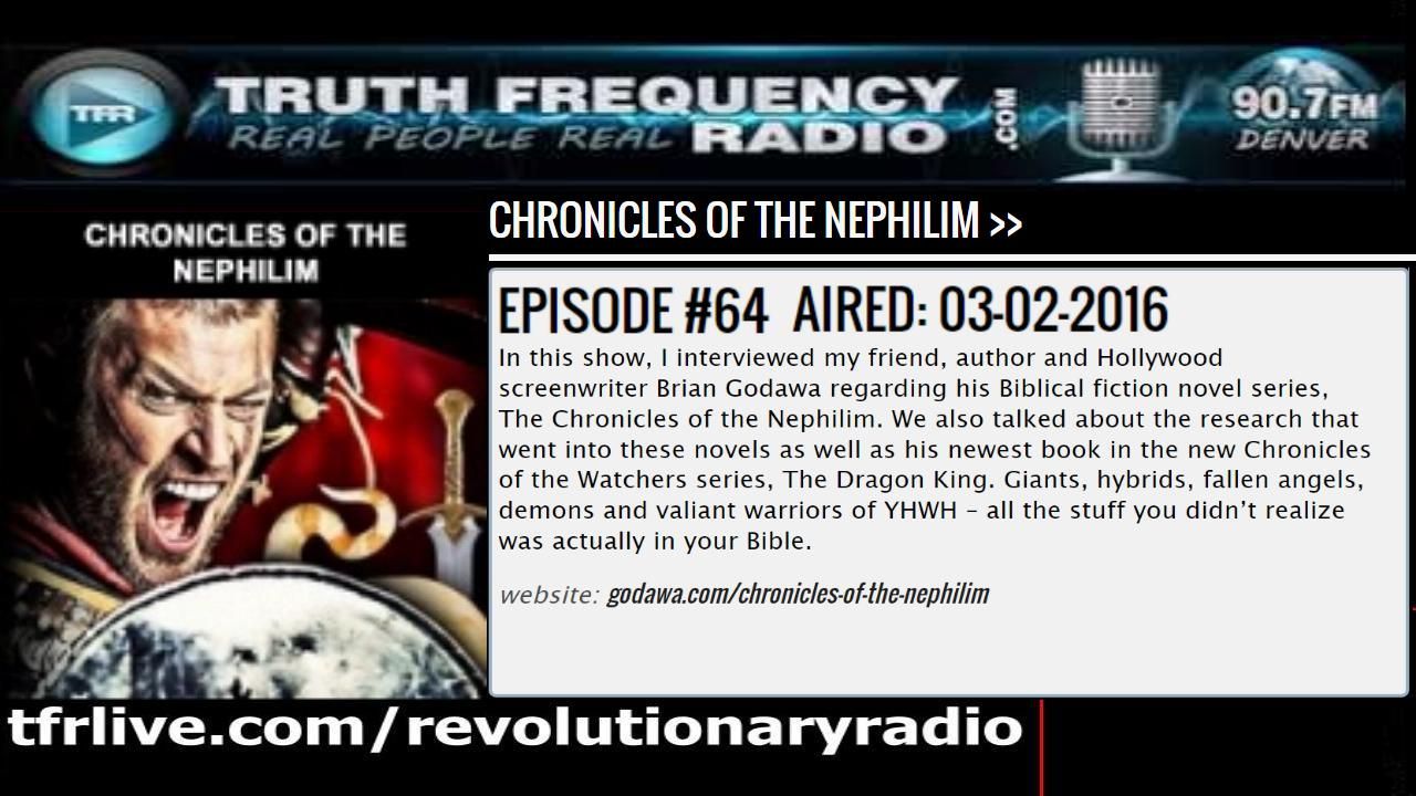 This broadcast was recorded on March 2, 2016. In this show, I interviewed my friend, author and Hollywood screenwriter Brian Godawa regarding his Biblical fiction novel series, The Chronicles of the Nephilim. We also talked about the research that went into these novels as well as his newest book in the new Chronicles of the Watchers series, The Dragon King. Giants, hybrids, fallen angels, demons and valiant warriors of YHWH – all the stuff you didn’t realize was actually in your Bible.