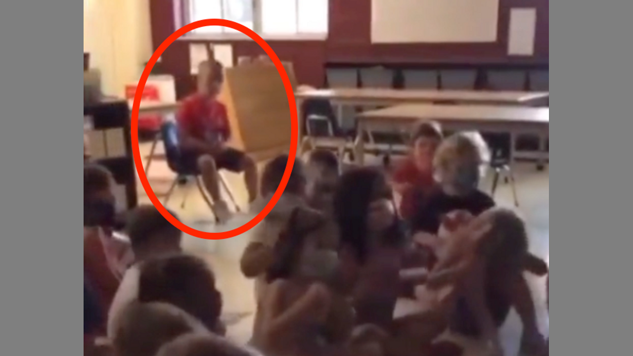 Unmasked child forced to sit alone at the rear of the class, whilst students sing a song about masks.