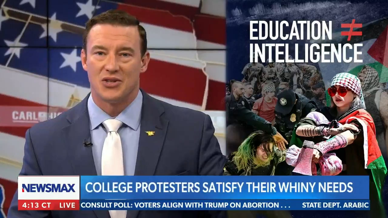 NEWSMAX · "This has everything to do with tearing things down and nothing to do with Israel whatsoever." Carl Higbie torched college students for their protests against Israel.