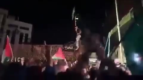 The Palestinian flags and Hamas's was raised on the wall of the US embassy by supporters of Hezbollah.