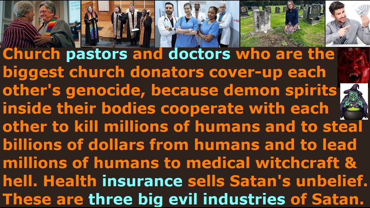 *** Intelligence news update from the Human Homo-Sapiens Race Survival Resistance (HRSR) headquarters and Republic Rebel Alliance battlefront (December 2023). Dave Hunt exposes the deception of Semjaza’s medical science witchcraft professions and industry and demonic pharmakeia witchcraft psychology psychiatry practices practiced & silently condoned by the Western feminist nations’ “Bible verses redefining, women’s head coverings rebelling, fallen angel head controlled, men’s pants cross-dressers androgynous transgender” fake Christians and Satan Lucifer’s “ordained & allowed & trained & non-assassination-attempts-receiving” fake unbiblical job position pastors. Whoever practices medical science witchcraft is already demon-possessed by Semjaza, so that is why every time we real Christians go to a doctor or dentist, they damage our bodies. It is an opportunity for Satan Lucifer to attack us, because we are going to a witch for healing. They encourage going to the doctors and dentists to mutilate our bodies and receive poison and pay money to the reptilian hybrid elites’ billion dollar depopulation & bio terrorism medical science witchcraft industry. This is why these fake pastors and fake Christians have the blood of millions of people on their hands, because by their silent condoning of evil and the medical science practitioners, they are guilty of the murder of millions of people themselves. If you watch someone getting murdered and you do not try to stop it, then you are guilty of that murder, too. We real Christians speak out against witchcraft and against the mass bio terrorist murder. The problem is that all their Satan Lucifer’s “ordained & allowed & trained & non-assassination-attempts-receiving” fake unbiblical job position pastors are hired shills of Satan Lucifer, too, so they are in on it with the doctors, and that is why they do not expose these doctors & nurses & pastors’ own medical science witchcraft church employee health insurance benefits’ heath insurance company employees and other mass genocide depopulation sickness industry murderers. Satan Lucifer’s religious system’s pastors were hired and are in cahoots with the medical science witchcraft demons, because they would lose their biggest church donators medical professionals from their church, if they kicked them out, and their church member witch assassins would assassinate them with heart attacks & strokes and slaughter their heathen families. The reason why the medical practitioner doctors & nurses & health insurance company employees do not expose Satan Lucifer’s religious system’s pastors or kick out the fake unbiblical job position pastors and parasite church staff from God’s house, who are also a mass genocide murder industry that is leading millions of people to hell and death by sword & famine & plague & demon armies, is because the demons that run both the medical science witchcraft mass murder industry and religious system mass murder industry work together and they both work for Satan Lucifer. They do not expose their own. Satan Lucifer’s goal for all his medical & religious hell’s army’s departments is very simple, and that is to steal and kill and destroy. They steal billions of dollars of ridiculous overpriced medical charges and ridiculously overpriced extortion illegal tithe income taxes, and they steal 50% of that money for their salaries & benefits & building bigger hospitals and churches, and they kill millions of people using witchcraft radiation & narcotics & vaccines and hundreds of redefined Bible verses to replace Jesus with hundreds of fake foreign gods, and they both destroy society and family units and godly precepts and people’s lives. Their goal is the same.