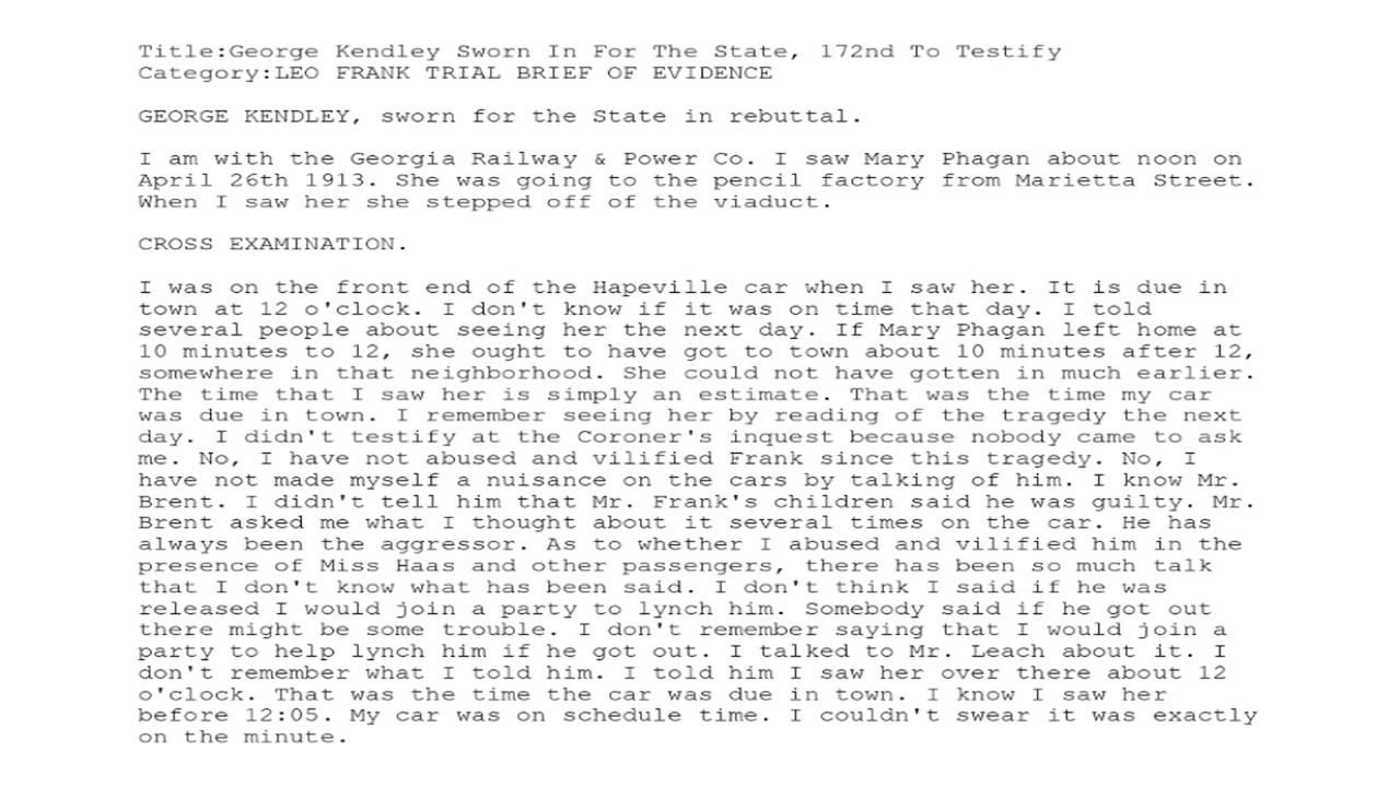 I was on the front end of the Hapeville car when I saw her. It is due in town at 12 o'clock. I don't know if it was on time that day. I told several people about seeing her the next day. If Mary Phagan left home at 10 minutes to 12, she ought to have got to town about 10 minutes after 12, somewhere in that neighborhood. She could not have gotten in much earlier. The time that I saw her is simply an estimate. That was the time my car was due in town. I remember seeing her by reading of the tragedy the next day. I didn't testify at the Coroner's inquest because nobody came to ask me. No, I have not abused and vilified Frank since this tragedy. No, I have not made myself a nuisance on the cars by talking of him. I know Mr. Brent. I didn't tell him that Mr. Frank's children said he was guilty. Mr. Brent asked me what I thought about it several times on the car. He has always been the aggressor. As to whether I abused and vilified him in the presence of Miss Haas and other passengers, there has been so much talk that I don't know what has been said. I don't think I said if he was released I would join a party to lynch him. Somebody said if he got out there might be some trouble. I don't remember saying that I would join a party to help lynch him if he got out. I talked to Mr. Leach about it. I don't remember what I told him. I told him I saw her over there about 12 o'clock. That was the time the car was due in town. I know I saw her before 12:05. My car was on schedule time. I couldn't swear it was exactly on the minute.