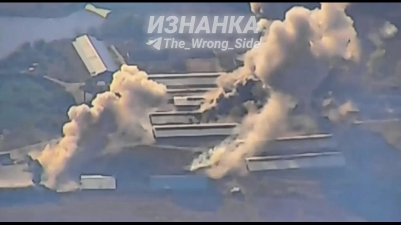 Air strike of the Russian Aerospace forces with cruise bombs on hangars where the Ukrainian armed forces was located. Area of the village of Glushkovka, Kharkiv region.
