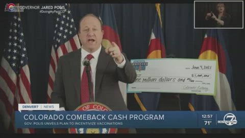 Five $1 million dollar checks are waiting for 5 winners Vaccinated and Un-vaccinated to be vaccinated by a certain date before they receive their win, if they win. This lottery happens during the month of June. Somewhere around 50% of Coloradans have been vaccinated. The governor wants all to be vaccinated.