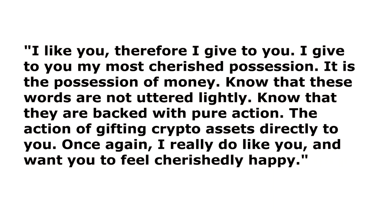 "I like you, therefore I give to you. I give to you my most cherished possession. It is the possession of money. Know that these words are not uttered lightly. Know that they are backed with pure action. The action of gifting crypto assets directly to you. Once again, I really do like you, and want you to feel cherishedly happy."