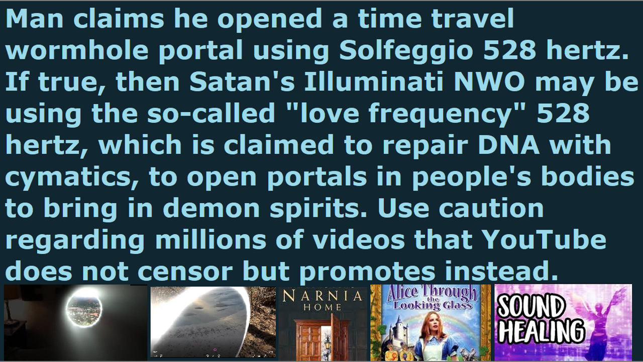 *** Intelligence news update from the Human Homo-Sapiens Race Survival Resistance (HRSR) headquarters and Republic Rebel Alliance battlefront (May 2022). I introduced in the past the 528 solfeggio hertz because a Christian scholar and professor and friend at church and even Zeph Daniel and Christian Harvard graduate medical doctor Len Horowitz said that it repairs DNA, and the Internet claims that microbiologists use the 528 hertz to repair DNA using cymatics laws of nature, since cancer cells are broken DNA mutated cells. I did years of research in the area. The Rife light therapy heals cancer, as well as sound does, too, so that is why the Illuminati NWO confiscated all such research information and killed thousands and thousands of scientists who discovered those simple cures for cancer with light and sound. The 528 hertz is called the “love frequency” of Creation, and it is one of the six solfeggio tones that are used in ancient music like the Gregorian chants. It may be just a hunch, but from criminal investigative deduction, I felt something is very suspicious that the Illuminati NWO erased all truth from the YouTube, but it does not remove all the millions of 528 hertz videos, which is supposed to be the frequency that repairs DNA strands. They do not remove the videos on 432 hertz either. So, I started doing some research. I found a video by one man who claims he opened a wormhole portal to Sedona using 528 hertz and dropping it to 525 hertz. Sedona is where all the Illuminati New Age Wicca witch “alien contactee” necromancy spirit guide channeling occultists go to, in order to communicate with their ascended master fallen angel “fake aliens” devils, because there are a lot of vortex wormhole portals there. They also have Draco reptilian chimera alien and Pleiadian fallen angels’ underground bases. In the video, the man also opens a portal to a different planet or different time travel wormhole to a different place on earth and walks through it. The place seems to have two suns. After the man opened the wormhole portal and put it out on the Internet, it is reported that he disappeared 4 months later, and has never been heard from again. There are Draco reptilian chimera alien incarnate avatar pedophile cannibal Satanists trying to debunk his videos, so that gives credibility to his videos and experiments. My conclusion is to not use the 528 hertz and 432 hertz, because we do not know if it is true or a deception. It may heal your DNA or it may open wormhole portals in your body, which might bring through evil spirits. My doubt is that if it did really heal damaged DNA from radiation and toxins, then Satan Lucifer and the Illuminati NWO would be first to erase all the millions of 528 hertz and 432 hertz videos from YouTube, but they have not done so. This is why I started becoming cynical and started researching. At this point in time, I would advise being on the cautious side and not use 528 hertz or 432 hertz or any frequency on the Internet. That goes the same with orgonite. If you have used 528 hertz or orgonite, it is best you pray in case they may be deceptions. There is a possibility that the “fake aliens” fallen angel devils may be using frequency to alter the timelines at a quantum level, too, because the man in the video finds in his Bible the original Bible verse that says “lion and the lamb,” instead of the newly changed Mandela Effect’s current Bibles that says “wolf and the lamb,” which is the wolf in sheep’s clothes version. The original Bible used to say the “lion of Judah and his church the lamb,” and not the “wolf Satan Lucifer,” until they changed it with the Mandela Effect.