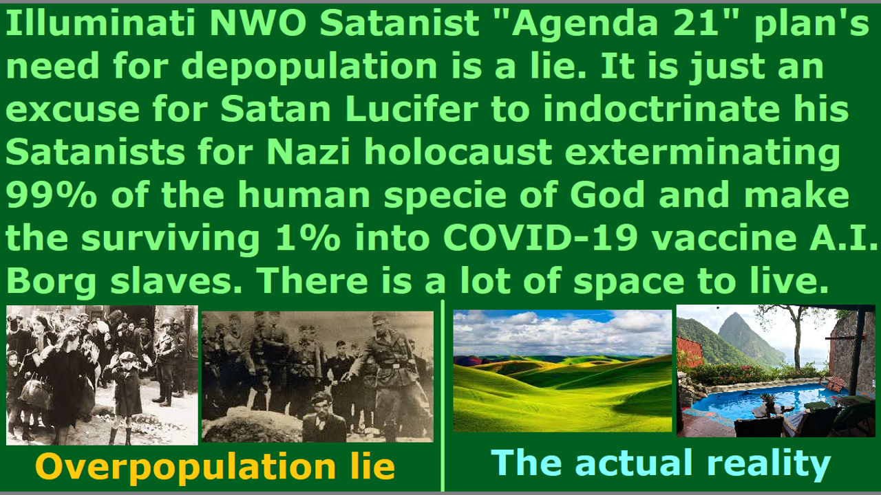 *** Intelligence news update from the Human Homo-Sapiens Race Survival Resistance (HRSR) headquarters and Republic Rebel Alliance battlefront (December 2021). NWO's need for depopulation is Satan Lucifer's lie to indoctrinate Satanists to exterminate God's humans. There is a lot of space on earth to live and accommodate billions of more people. They are planning to get rid of 99% of what they call the “useless eaters,” and use the 1% that their COVID-19 Coronavirus AI femtobot nanite 5G remote assassination t-Veronica zombie virus Borg biochemical weapon vaccine chooses as child sex slaves and livestock human meat food and laboratory experiment specimens and Mars planet mining slaves and cyborg industry products. The Ceres planet Nazi 4th Reich imperial space fleet has built cities on thousands of planets and has millions of population. Satan Lucifer is all about depopulation and genocide and eugenics and feminist witches’ satanic sacrifices and cannibalism and pedophilia and destroying and killing and stealing and lying and deceiving. Our Almighty Holy Righteous Loving Creator God YHWH Jesus is about giving life by coming himself as Jesus to die on the cross so that we who believe may receive forgiveness for sins and the gift of eternal life. Repent and receive Jesus as Savior, and make straight the way of the Lord! End of transmission…