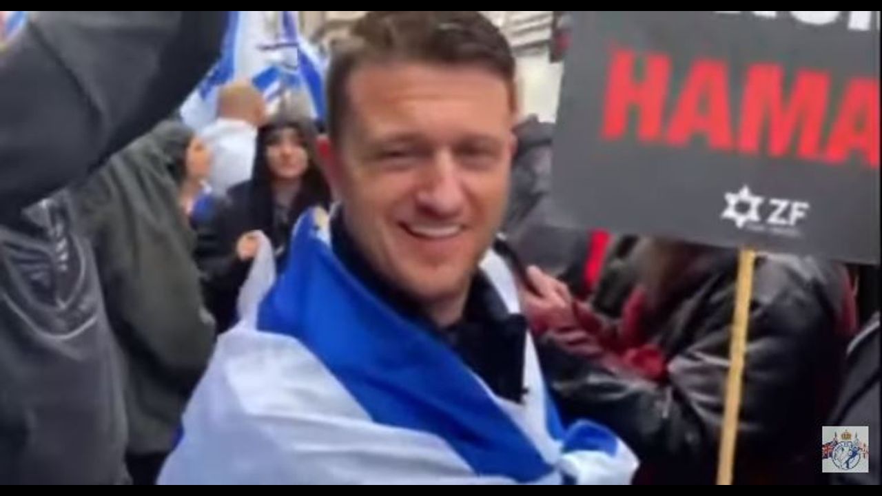 TOMMY ROBINSON DRAPED IN ISRAELI FLAG SHOWS UP AT PRO-ISRAEL GATHERING SMIRKING