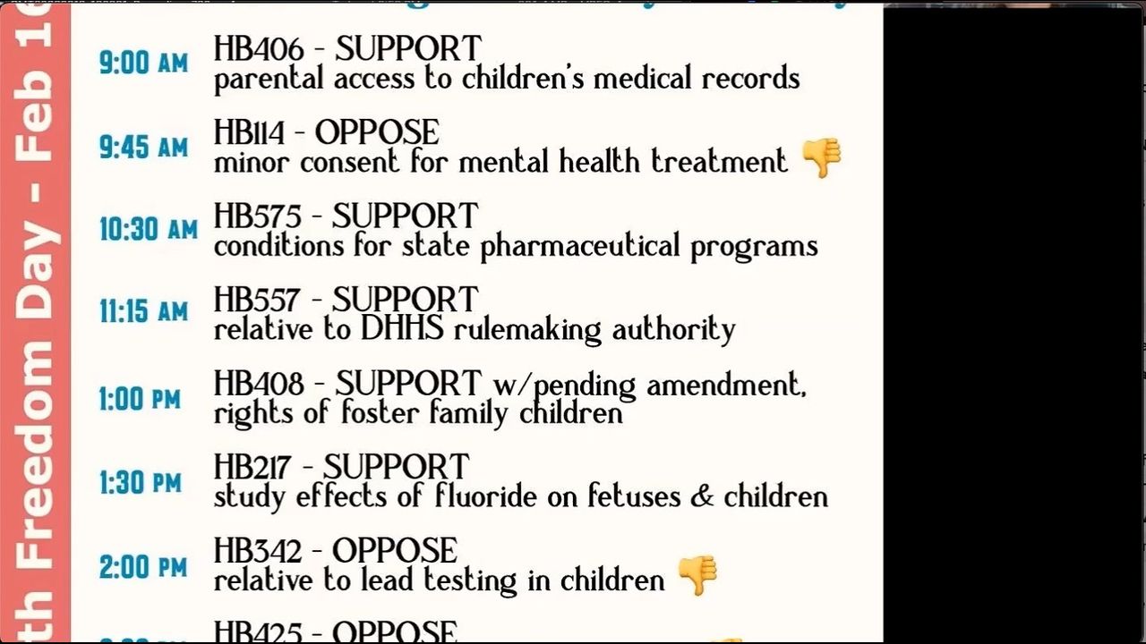 Today's zoom featured Larisa of Health Freedom NH, discussing a number of health freedom bills to heard in committee on Thursday Feb 16 (all day) - plus a report by Kevin on the recent cell tower setback hearing. HFNH is also sponsoring a Children's Health Defense meeting in Keene on Saturday Feb 18. We also discuss the rollout of Digital ID and the Total Surveillance State, the coming "fake alien invasion" psyop, the danger of root canals, the censorship of health care providers, and more.