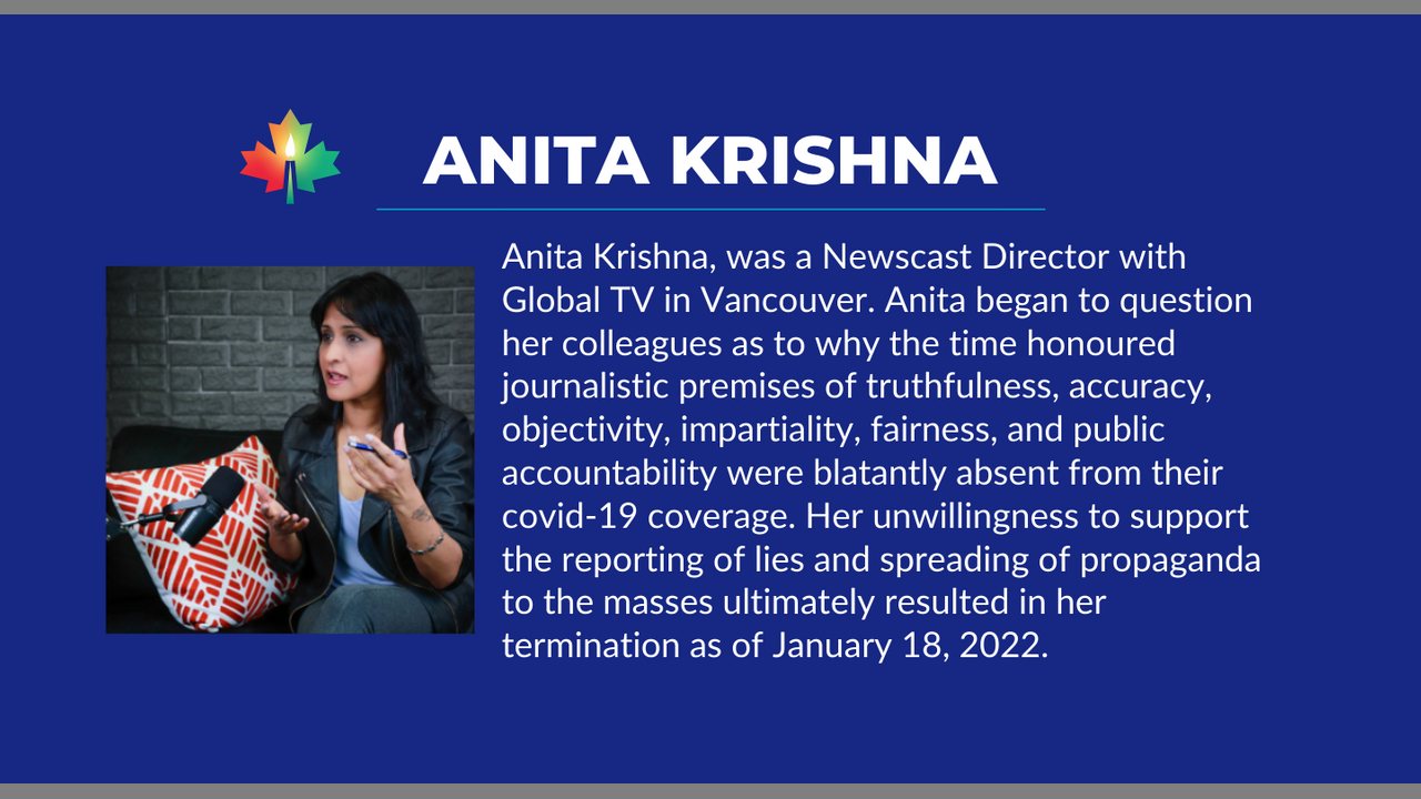 Anita Krishna, was a Newscast Director with Global TV in Vancouver. Anita began to question her colleagues as to why the time honoured journalistic premises of