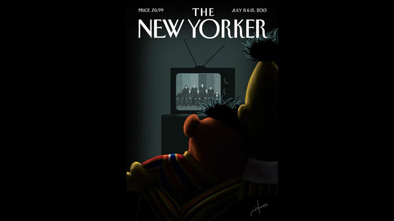 The New Yorker is celebrating the Defense of Marriage Act ruling with the July 8-15, 2013 cover called “Moment of Joy”, featuring Bert and Ernie cuddling on their couch watching the landmark Supreme Court ruling unfold on TV.