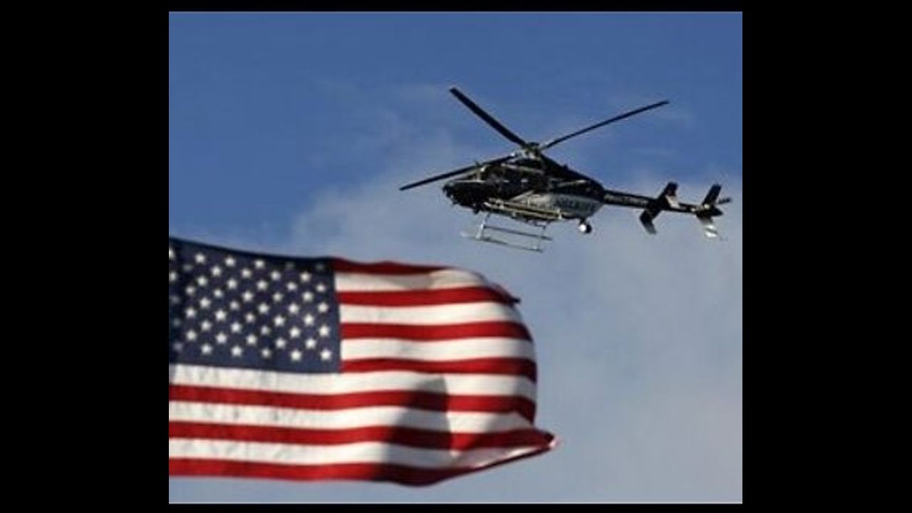 Police Helicopter flying along the convoy with an American Flag
