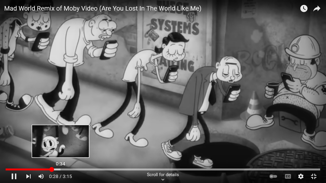 After seeing a low-res instrumental remix of this powerful Moby music video on my phone, I felt it was screaming out for an HD edit with Michael Andrews and Gary Jules cover of "Mad World". This amazing animation by Steve Cutts tells a powerful story, with or without the music.