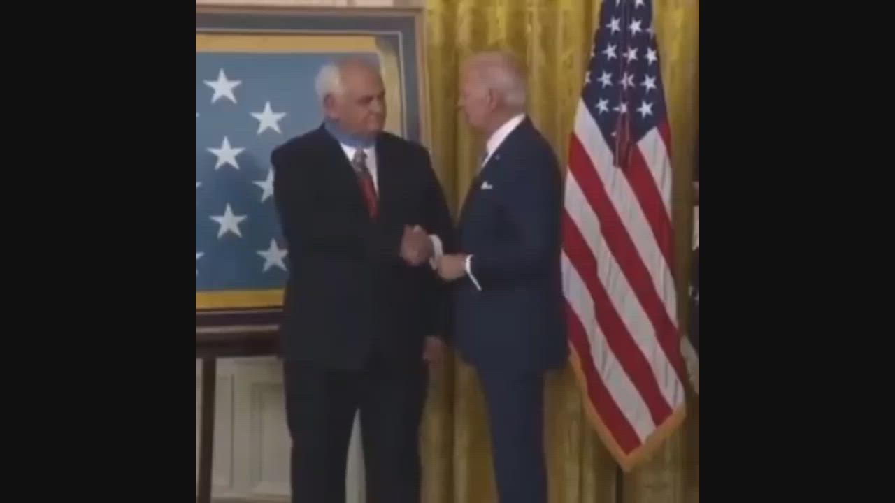 Actor Byeden places medal on backwards.