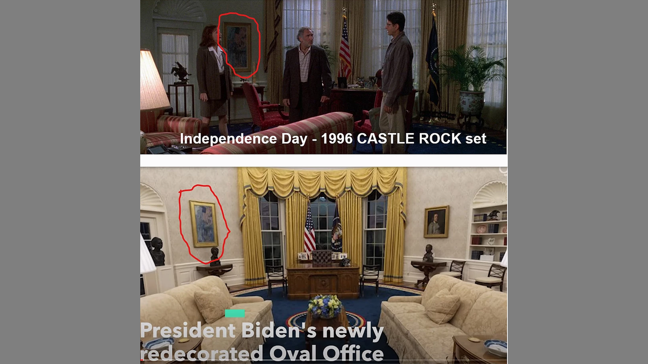 This video was supposedly made by Zane from Conservative News Network. There seems to be evidence showing traitor joe is at Amazon Studios in Culver City, CA, and some saying he isn't. You decide. If you zoom in on the thumbnail for this video, you can see the circled picture on the wall is the same. If you look above the wood pile on the left in this link, you can see the oval office. The picture was taken in 2019 while construction was going on. https://www.google.com/maps/place/Amazon+Studios/@34.0243876,-118.3928033,3a,75y,129.22h,83.58t/data=!3m8!1e1!3m6!1sAF1QipNPGrRU3K1mrM6RWB-yRVQ1o2yq1fnlN6aMmpZb!2e10!3e11!6shttps:%2F%2Flh5.googleusercontent.com%2Fp%2FAF1QipNPGrRU3K1mrM6RWB-yRVQ1o2yq1fnlN6aMmpZb%3Dw203-h100-k-no-pi-10-ya115.00001-ro-0-fo100!7i8704!8i4352!4m7!3m6!1s0x80c2b987640d7223:0xfd01d00d0eaa5a21!8m2!3d34.023946!4d-118.3925358!14m1!1BCgIgARICCAI