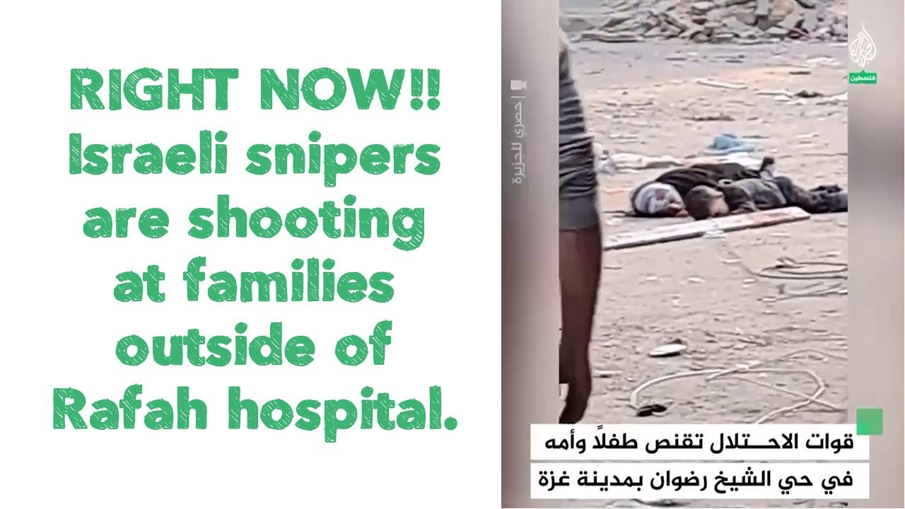 RIGHT NOW⚡️ Israeli snipers are shooting at families outside of Rafah hospital. Brave Palestinians are trying to save the baby.