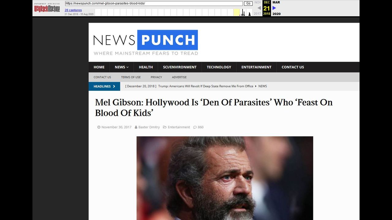 « Mel Gibson : Hollywood est un "repaire de parasites" qui "se nourrit du sang des enfants". Les studios d'Hollywood 'baignent' dans le sang d'enfants innocents" selon Mel Gibson qui affirme que la consommation de "sang de bébé est si populaire à Hollywood qu'elle fonctionne fondamentalement comme une monnaie à part entière".