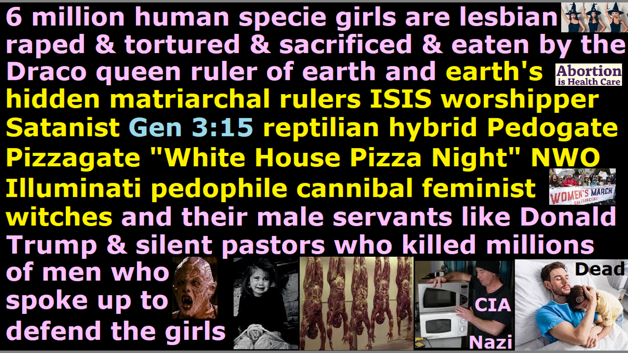 The reptilian hybrid ISIS goddess cult Satanist witches have run the world since Noah’s Atlantis nephilim days through secret societies and sisterhood covens. They cooked alive with CIA microwave oven weapons from next door homes and killed millions of men, who spoke up against their feminism’s plan to destroy society and remove God and exterminate all humans and replace them with returned nephilim & chimera alien incarnate avatar globalist elites released from the abyss once more using abortion sacrifice black magic energy, in order to defend the human women & girls from the NWO globalist elite pedophile cannibal “Hansel & Gretel witches.” The earth’s hidden matriarchal ruler witches like Hillary Clinton (who is the Draco Pleiadian reptilian hybrid royal bloodline avatar demon spirit actual president of America who manages the Joe Biden male clone), and millions of more in the black nobility families and royal families and Hollywood celebrities and idol singers and models and corporate leaders and church pastors and military leaders and media celebrities and every other feminist in every aspect of society, MILAB abduct 12 million human children every year, and gauge out their eyes, and pull out their intestines alive, and saw off their arms and legs alive, and use forceps to pull out their brain from their nostrils which they call the “walnut,” in order to eat them. Humans and aborted babies are staple diet for reptilian hybrid elite matriarchal ruler feminist “Hansel & Gretel” witches. Their Illuminati NWO mainstream media and police and courts were made by the Dracos to protect themselves, so this is why you do not hear a single word about the 12 million children that go missing every year. It is an irony that the religious Christian women idolize these feminist leaders, because these feminists are the ones kidnapping and lesbian raping and eating their children, using their CIA NSA MI6 FBI Freemason Jesuit Wicca Black Ops feminist male servants and Illuminati space fleet feminist male servants and global child trafficking ring feminist male servants. The earth’s hidden matriarchal rulers Illuminati globalist elite New Age Wicca witch feminist globalist elites cook alive with CIA microwave oven weapons and try to kill and silence us real Christian men of our Almighty Holy Righteous Loving Creator God YHWH Jesus, because we speak out God’s 100% truth unlike their Illuminati 501c3 church pastors, in order to defend the human women & girls. They consider us real Christian men as male chauvinist pigs and puny human meat livestock people who dare speak against their royal bloodline “Draco blue blood” reptilian hybrid witch elite rulers of planet earth. No one gets in their way and their prey the human specie girls human meat food child sex slaves, just like you do not step in front of a feminist komodo dragon and its prey a little female sheep. If you speak about it or expose their pedophile cannibal “Hansel & Gretel” global matriarchal feminist rulers, then they kill you just like they killed millions of whistleblowers throughout the last 5,000 years since Noah’s Atlantis flood days. These European black nobility families’ bosses, the Illuminati top hierarchy “White Lodge Brotherhood” ascended master fallen angel devils are now trying to set up their NWO one-world government. They cannot kill us real Christians.