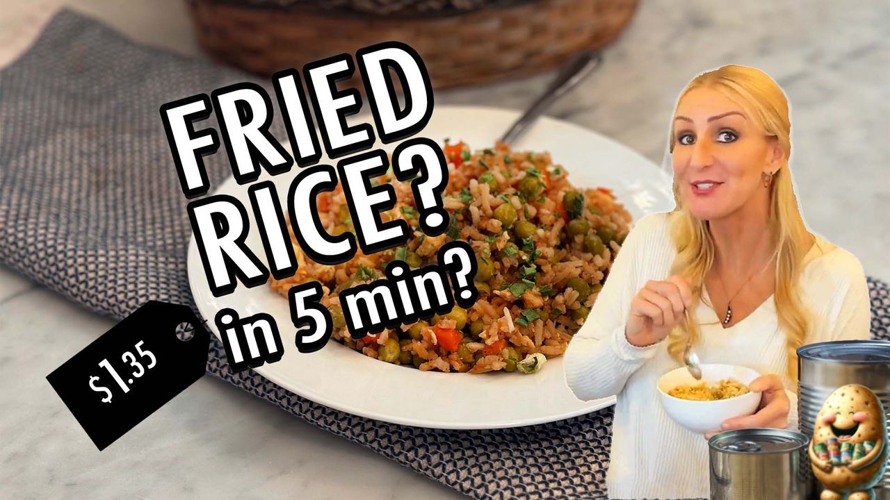 š5 min HACK for Fried Rice for just $1.35 /person using only shelf stable and canned ingredients. RECIPE ⤵