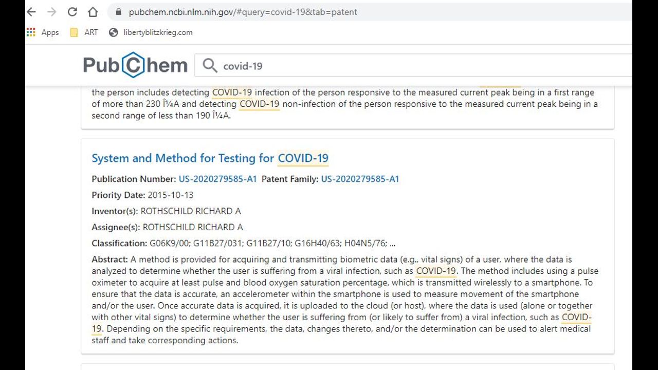A Government website PubChem shows the Covid has 97 patents. Testing Patent is dated back to 2015 held by David Rothchild.