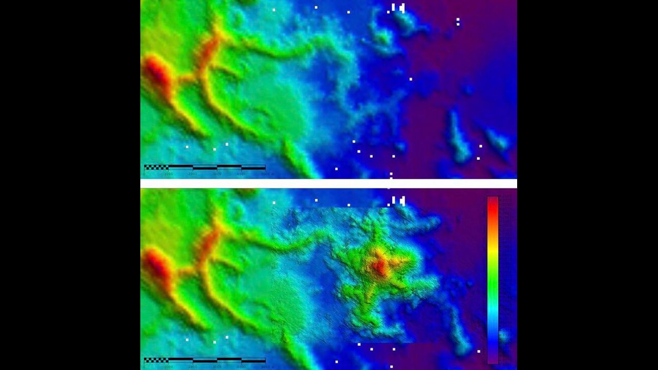 The new submarine #volcano is very clear. Summit height (red) 800m, trench depths (purple) 2568m, 5km wide. The summit is still below sea surface