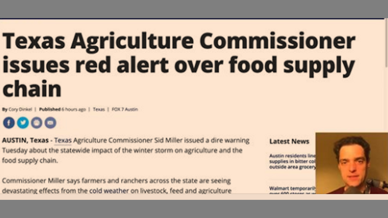 Texas' Ag Commissioner has issued a RED ALERT as the power grid is down and our food supply is grinding to a halt. Agriculture is not "critical infrastructure," and reports of blackouts tonight extend to ND, SD, NE -- livestock producers unable to provide water to their animals, and farmers unable to deliver to grain elevators that are shut down. Welcome to the Grand Solar Minimum. Christian breaks down the latest on this developing situation.