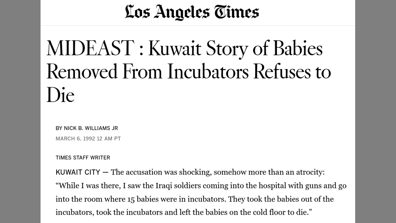 I came across this article in the Sun UK and I shook my head and sighed. They are using the same HOAX story from the 1990 Kuwait Gulf War with the Babies in Incubators. It worked so well (for a time back then) that the script writers are using it 32 years later.