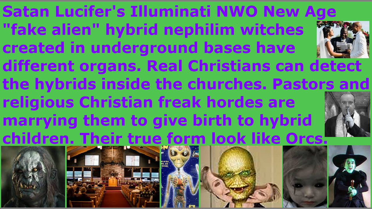 The real Christians are able to identify the hybrid nephilims and chimeras inside the church. That is why they are a threat to the devil and his Illuminati NWO. The pastors and religious Christian freak hordes, who are redefining Bible verses and rebelling against women’s head coverings so that their heads are controlled by the fallen angels, are marrying the hybrids and nephilim & chimera alien incarnate avatars and androids and clones and animals upgraded to human gene bodies, in order to birth hybrid children. Joe exposes that the true appearances of the hybrid nephilim “fake aliens” incarnate avatars in cloned hybrid human avatar bodies and shapeshifters inside the churches resemble the appearance of the orcs in the “Lord of the Rings” movies. Pastor Doug Riggs warns that the nephilim children of the fallen angels are not benevolent aliens from space to save humankind, but they are manufactured in the underground bases. They are hybrid offspring of the “Twilight Saga vampire” fallen angel fathers, who are drinking human children’s gene blood to take human form to breed nephilims with their Illuminati NWO New Age Wicca witch “alien contactee” necromancy spirit guide channeling human women servants. The End Times apostate harlot Church pastors and religious Christian freak hordes, who are rebelling against women’s head coverings so that their heads are controlled by the fallen angels, are condoning them by their silence and hiding in fear, because they do not want to get assassinated and cooked alive by CIA microwave oven weapons from next door homes and rooms, and their genetic descendants slaughtered, and get ridiculed by their church donators as lunatic heretic idiotic narcotic maniacs, or they are Satanist non-human entities themselves. This is why they do not warn the humans that 33.3% of their “women’s equality” Western feminist nations have been replaced by the returned nephilim & chimera avatars, and 70% of their military and police are infiltrated, and that a lot of their pastors and church staff and church members are pedophile cannibal Satanist reptilian hybrid globalist elites, and that 12 million children are being tortured & lesbian raped & sacrificed & eaten by the earth’s hidden matriarchal rulers witches. They are the fake “Bible’s watchmen on the wall,” who are making billions of dollars from Satan Lucifer’s pre-1941 “The Plan’s” Bible prophecy rapture billion dollar industry and the Satan Lucifer’s Illuminati religious system unbiblical 10% salary tithe taxes theft. Kick these pastors and 99% of the church member religious Christian freak hordes out of the devil’s harlot Church, so that God’s Holy Spirit can flow back into his house. End of transmission…