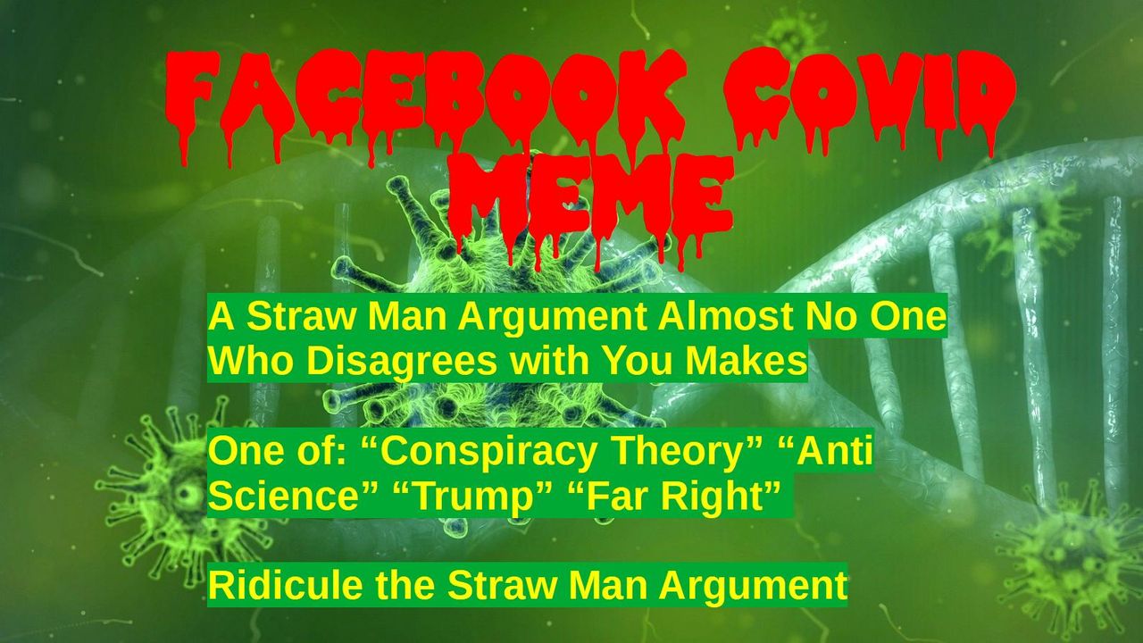 A short critique of Facebook COVID Memes. Memes oversimplify the issues and usually consist of a straw man argument that almost no one who disagrees with the Meme maker actually makes. Often loaded terms such as "conspiracy theory," "anti-science," "Trump," "Far Right" and so forth are thrown in. The Meme then ridicules the straw man argument.