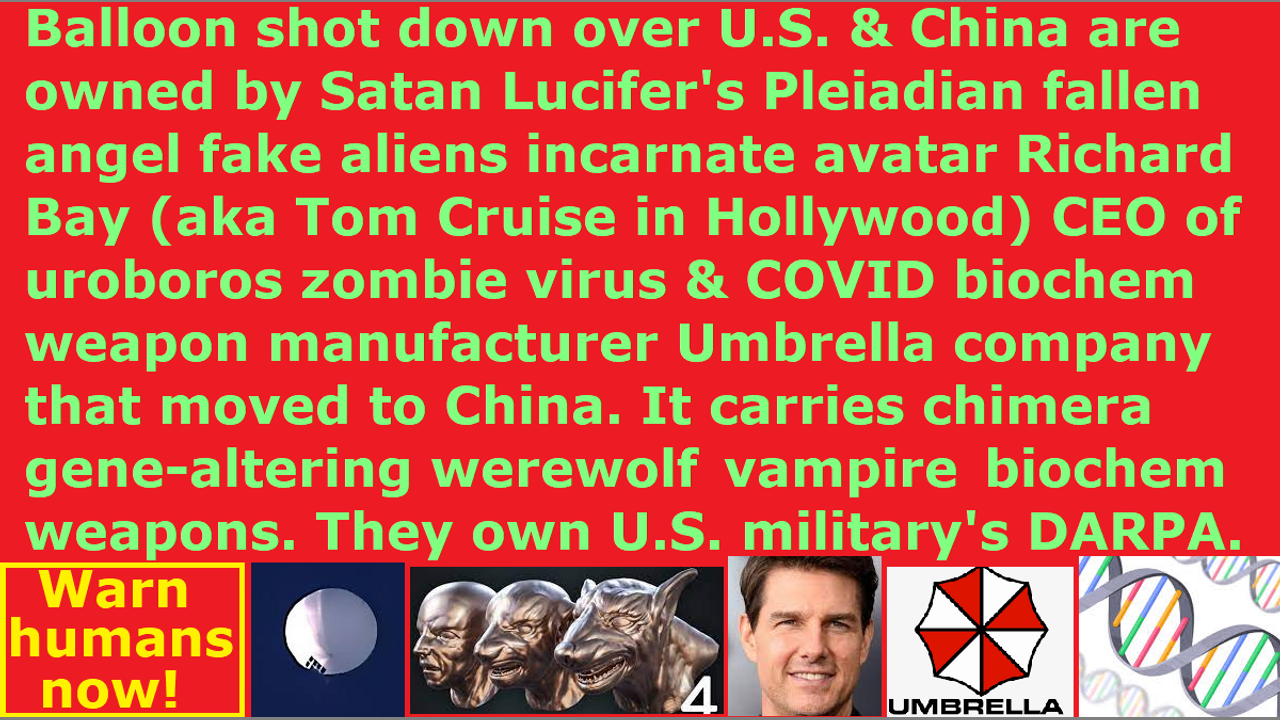 *** Intelligence news update from the Human Homo-Sapiens Race Survival Resistance (HRSR) headquarters and Republic Rebel Alliance battlefront (February 2023). The highly-advanced technology biochemical weapon balloon shot down in America after one month was owned by the uroboros zombie virus & COVID biochemical weapon vaccine manufacturer Umbrella company, whose subsidiary companies are Rio Tinto & the Chinese Norinco company, whose CEO is the Pleiadian Watcher fallen angel fake alien incarnate avatar Richard Bay (aka Tom Cruise in Hollywood) and whose chief scientist is the Pleiadian Watcher fallen angel incarnate avatar Bill Gates. The Chinese government buys tanks and military hardware weapons from Norinco, but has no concern about Norinco’s biochemical weapon manufacturing. Satan Lucifer’s Noah’s days Atlantis fallen angel owned 5,000 year old Umbrella company (now renamed Rainstorm company after moving to China) and the fallen angel devils’ Shadow Group (now moved to China) and their DARPA and the Shaw House (Pleiadian fake aliens fallen angel owners of the commonwealth nations) will be using these balloons and ICBM missiles against different Western feminist nations that are under judgment by sword & famine & plague & demon armies. When they redefined Bible verses to rebel against women’s head coverings to kick out Jesus who is the Word of God, and they started cross-dressing in Satan Lucifer’s post-1960s cross-dress-project men’s pants to mock God, and they started stealing unbiblical post-1873 10% salary illegal tithe income taxes to defame God’s name, and filled the churches with millions of “naked women’s heads” “men’s pants cross-dressing” religious Christian hordes to desecrate God’s house, they opened up their Western feminist nations to be taken over by fallen angel fake aliens incarnate avatar leaders and the Umbrella company. They do not have God’s protection anymore. When the Church becomes corrupt, and runs after foreign gods and redefines hundreds of Bible verses, then it takes away God’s protection, and demon incarnate avatars come in to take over the Western feminist nations, and they create hybrid demon spirit incarnate avatar witches like Jessica to conduct witchcraft and communicate with demons, and that increases occult witchcraft in the world, which allows all these fallen angel devils to start doing all these plagues & wars & famines & demon army invasion of earth, and then God’s judgment comes. As Pastor Derek Prince said, you will see a surge of the occult & Jessica’s witchcraft (witchcraft is called rebellion in the Bible) & New Age & demonic activities, as humanity becomes more and more evil, because it brings in all the fake humans and hybrid witches and demons and devils to take over the civilization just as in Noah’s Atlantis flood days and Sodom & Gomorrah’s LGBTPB (lesbian gay bisexual transvestite pedophile bestiality) days. It is the ungodly Bible-desecrating religious Christian hordes and pastors that bring in these occult witch hybrids in like Jessica, who communicate with these fake alien demons and fake ascended master fallen angel devils, which bring in these plagues & wars & famines & demonic invasions, which is God’s judgment for the total corruption and occult witchcraft and communication with fallen angel devils & demons and degradation of society. Hybrid witches like Jessica is a sign that the End has come. The Shadow Group’s fallen angel devils will blame China and the Chinese people for the mass genocide of our human homo-sapiens specie. These UFOs are being shot down in both America and China, and not just over America. The fallen angels always use false flags to pit nations against nations to cause wars between the humans, in order to control them.