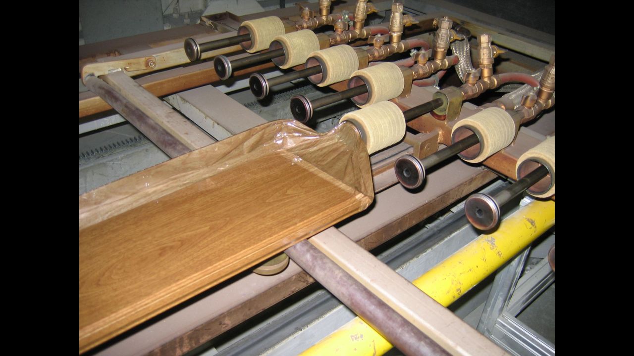 Loading of the profiles from one open side of the trolley permitting the operators to work better also deep inside. At the end of the curing cycle the vacuum action reverses into blowing action in order to separate the film from the decorated profiles.
