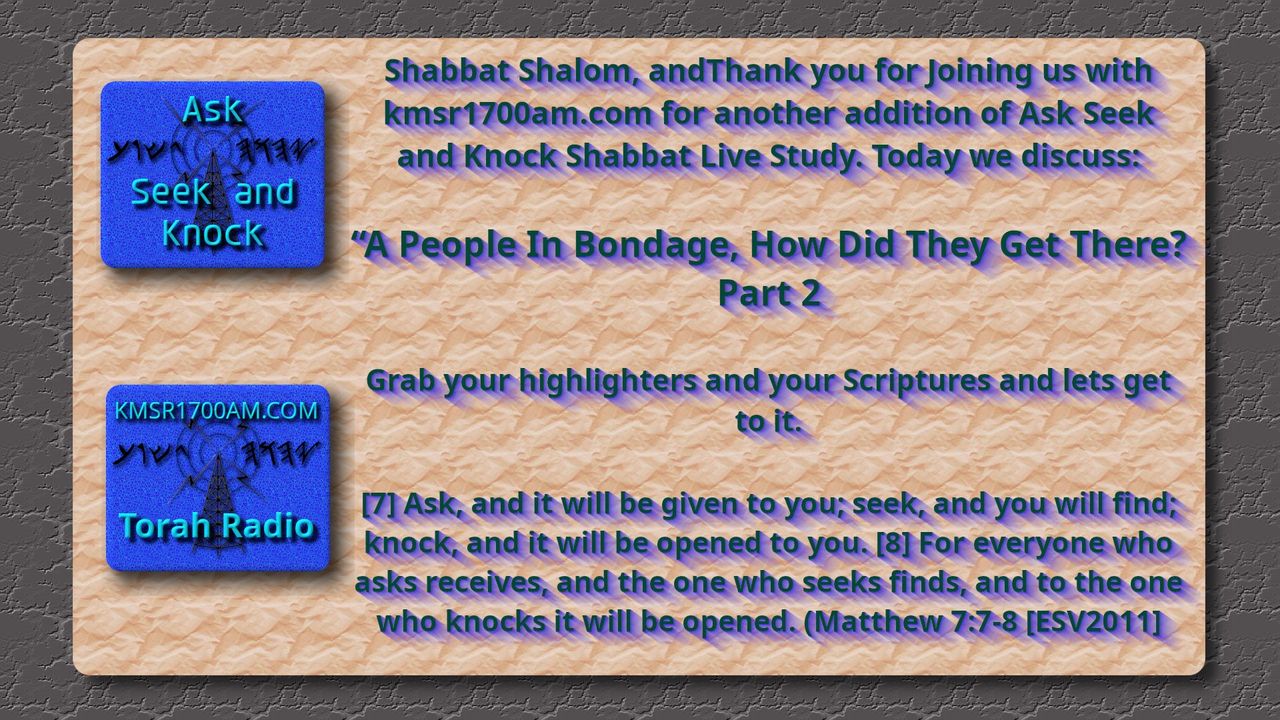 Shabbat Shalom and Thank you for Joining us with kmsr1700am.com for another addition of Ask Seek and Knock Shabbat Live Study. Today we discuss the topic “A People In Bondage. How Did They Get There? Part 2”. Grab your highlighters and your Scriptures and lets get to it.