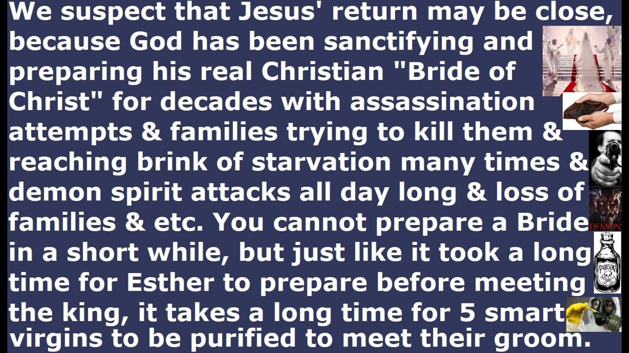 *** Intelligence news update from the Human Homo-Sapiens Race Survival Resistance (HRSR) headquarters and Republic Rebel Alliance battlefront (August 2025). We suspect that Jesus' return may be close, because God has been sanctifying and preparing his real Christian "Bride of Christ" for decades with assassination attempts & families trying to kill them & reaching the brink of starvation many times & demon spirit attacks all day long & loss of families & etc. You cannot prepare a Bride in a short while, but just like it took a long time for Esther to prepare before meeting the king, it takes a long time for the 5 smart virgins to be purified to meet their groom. The question is: Are the huge masses of September 23, 2025 rapture dreamers all over the internet now God's true prophets warning to repent, or Satanist deceivers, or both, or Christians who are also witch mediums receiving demonic dreams, or is it a preemptive deception by the enemy to make people disappointed & go back to sin? Pray against all plots of the enemy. Real Christians should always be ready & instead busily about God's work. Masses of Muslims are having dreams of Jesus & getting saved. It is those lukewarm Christians, who are not trusting in God to purify and sanctify them, and running away from God’s discipline because of cowardice & treachery & love for the things of this world including genetic descendant idols & selfishness & fear & love for church donations & love for money & love for safety from assassination attempts & love for safety from ridicule by church donators & pastors’ reputations & love for the hundreds of redefined Bible verses’ hundreds of fake foreign gods, who have a fear of the rapture. We real Christians do not have time to be worried about the September 23, 2025 rapture dreams of so many people, because we are receiving assassination attempts every day with faith & courage and fighting every day to warn & teach & expose & inform & encourage & admonish & exhort & preach salvation & forgiveness & mercy & grace & Christ to the 8 billion people. The millions of American fake Christians, who pay billions of dollars of donations to their Satan Lucifer’s pre-1941 “The Plan’s” Bible prophecy rapture billion dollar industry Draco reptilian chimera fake alien incarnate avatar pedophile cannibal Satanist pastors diversion distractors, and who buy millions of dollars of Bible prophecy rapture books & conference tickets & cruise ship tours sold by these Satanist pastors money-makers, and who worship the rapture as their idolatrous god, are the exact same millions of fake Christians who get angry and become rapture-haters and go back to their sinful lives when the rapture does not occur every time when these Bible prophecy rapture billion dollar industry Draco avatar pedophile cannibal Satanist pastors’ rapture date-setting prophecies do not come true and the rapture does not occur on the dates they claimed it would take place. Preach this in your next Sunday church service sermon, so that all your church member witch assassins will try to assassinate you and slaughter your genetic descendant idols, and 99% of your church donators will leave your church in disgust & anger & sheer terror, so that God’s house will be cleansed of their religious filth. Do it now and do not wait until tomorrow, unless you are a crazy lunatic who has lost all common sense of the Holy Spirit. Jesus died on the cross to atone for your sins, and he rose again, and he is seated on his throne in heaven reigning, so that whoever repents and receives him as Savior & Lord will receive forgiveness for sins and the gift of eternal life. Repent and receive Jesus as Savior, and make straight the way of the Lord!