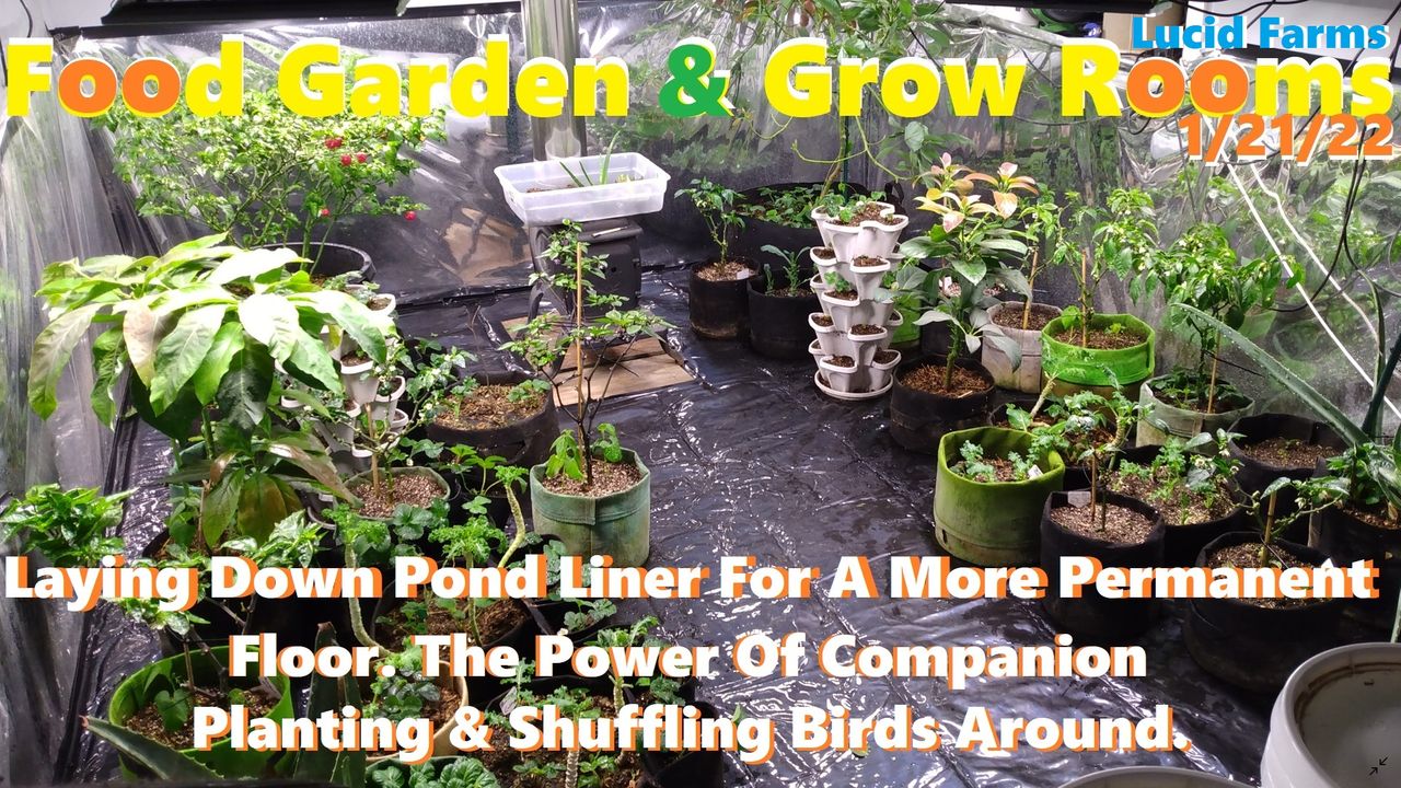 Laying Down Pond Liner For A More Permanent Floor. The Power Of Companion Planting & Shuffling Birds Around. 1/21/22 Food Garden & Grow Rooms.
