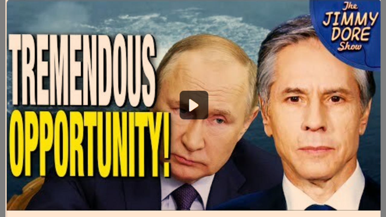 Oct 4, 2022 We all know that Russia blew up its own Nord Stream Pipeline even though there’s no good reason for them to have done so. But it’s a good thing they did, those dummies, because according to U.S. Secretary of State Antony Blinken, the shutdown of the pipeline represents a “tremendous opportunity” to wean European countries off of Russian gas and — don’t be shocked — instead buy their liquefied natural gas from the United States! Jimmy and America’s Comedian Kurt Metzger discuss the crazy circumstances that would lead Putin to blow up a pipeline delivering his own country’s gas and hand the United States such a gift. 'Become a Premium Member: https://jimmydorecomedy.com/join Go to a Live Show: https://jimmydorecomedy.com/tour Subscribe to Our Newsletter: https://mailchi.mp/jimmydorecomedy/yt... The Jimmy Dore Show Website: https://jimmydorecomedy.com/ Kurt Metzger on Twitter: https://twitter.com/kurtmetzger Kurt’s website: http://www.KurtMetzgerComedy.com LIVESTREAM & LIVE SHOW ANNOUNCEMENTS: Join the Email list: https://mailchi.mp/jimmydorecomedy/yt... Twitter: https://twitter.com/jimmy_dore Facebook: https://www.facebook.com/JimmyDoreShow Instagram: https://www.instagram.com/thejimmydor... WATCH / LISTEN FREE: Videos: https://jimmydorecomedy.com/watch Podcasts: https://jimmydorecomedy.com/podcasts (Also available on iTunes, Apple Podcasts, Spotify, Google Podcasts, or your favorite podcast player.) ACCESS TO FULL REPLAYABLE LIVESTREAMS: Become a Premium Member: https://jimmydorecomedy.com/join SUPPORT THE JIMMY DORE SHOW: Make a Donation: https://jimmydorecomedy.com/donate Buy Official Merch (Tees, Sweatshirts, Hats, Bags): https://jimmydorecomedy.com/store DOWNLOAD OUR MOBILE APP: App Store: https://apps.apple.com/us/app/jimmy-d... Google Play: https://play.google.com/store/apps/de... Jimmy Dore on Twitter: https://twitter.com/Jimmy_Dore Stef Zamorano on Twitter: https://twitter.com/miserablelib About The Jimmy Dore Show: #TheJimmyDoreShow is a hilarious and irreverent take on news, politics and culture featuring Jimmy Dore, a professional stand up comedian, author and podcaster. The show is also broadcast on Pacifica Radio Network stations throughout the country.Show less