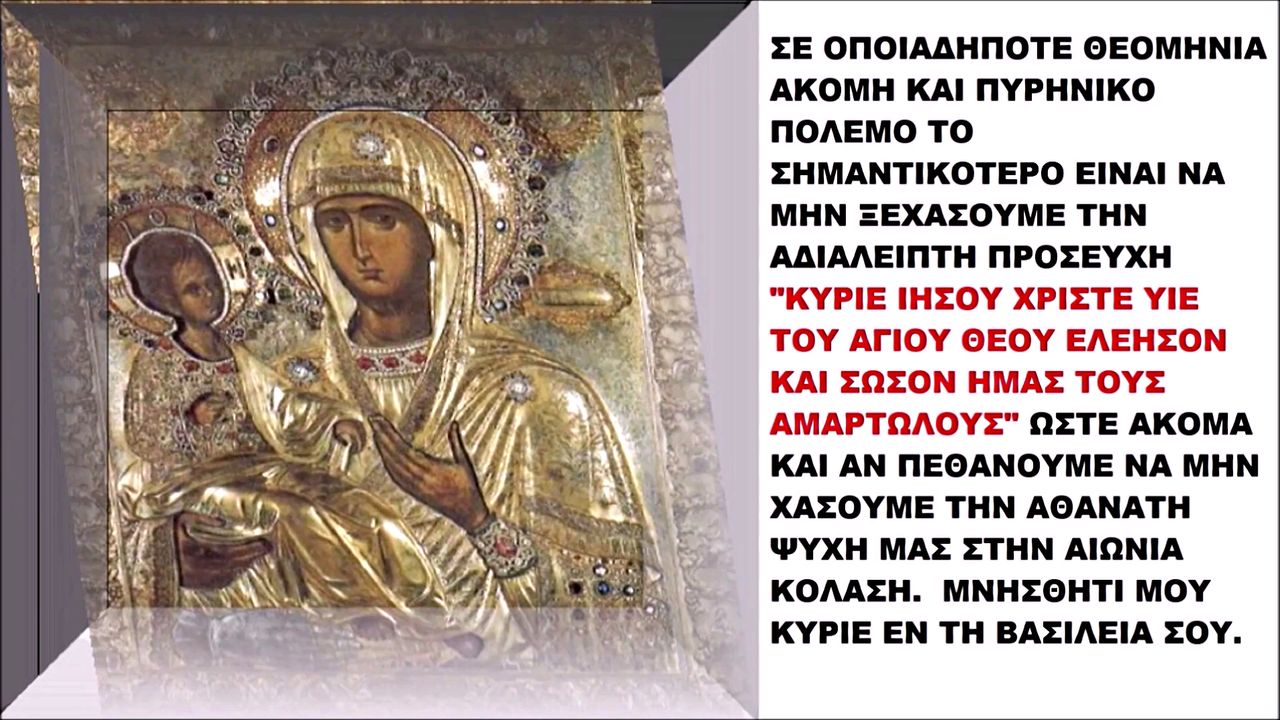 ΣΕ ΟΠΟΙΑΔΗΠΟΤΕ ΘΕΟΜΗΝΙΑ ΑΚΟΜΗ ΚΑΙ ΠΥΡΗΝΙΚΟ ΠΟΛΕΜΟ ΤΟ ΣΗΜΑΝΤΙΚΟΤΕΡΟ ΕΙΝΑΙ ΝΑ ΜΗΝ ΞΕΧΑΣΟΥΜΕ ΤΗΝ ΑΔΙΑΛΕΙΠΤΗ ΠΡΟΣΕΥΧΗ "ΚΥΡΙΕ ΙΗΣΟΥ ΧΡΙΣΤΕ ΥΙΕ ΤΟΥ ΑΓΙΟΥ ΘΕΟΥ ΕΛΕΗΣΟΝ ΚΑΙ ΣΩΣΟΝ ΗΜΑΣ ΤΟΥΣ ΑΜΑΡΤΩΛΟΥΣ" ΩΣΤΕ ΑΚΟΜΑ ΚΑΙ ΑΝ ΠΕΘΑΝΟΥΜΕ ΝΑ ΜΗΝ ΧΑΣΟΥΜΕ ΤΗΝ ΑΘΑΝΑΤΗ ΨΥΧΗ ΜΑΣ ΣΤΗΝ ΑΙΩΝΙΑ ΚΟΛΑΣΗ. ΜΝΗΣΘΗΤΙ ΜΟΥ ΚΥΡΙΕ ΕΝ ΤΗ ΒΑΣΙΛΕΙΑ ΣΟΥ.