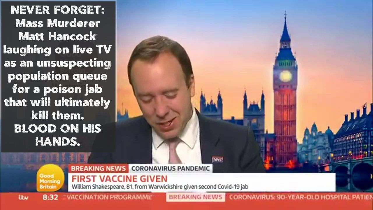 NEVER FORGET: Mass Murderer Matt Hancock laughing on live TV as an unsuspecting population queue for a poison jab that will ultimately kill them. BLOOD ON HIS HANDS.