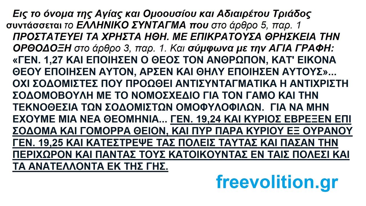Eις τo όνoμα της Aγίας και Oμooυσίoυ και Aδιαιρέτoυ Tριάδoς συντάσσεται το ΕΛΛΗΝΙΚΟ ΣΥΝΤΑΓΜΑ που στο άρθρο 5, παρ. 1 ΠΡΟΣΤΑΤΕΥΕΙ ΤΑ ΧΡΗΣΤΑ ΗΘΗ. ΜΕ ΕΠΙΚΡΑΤΟΥΣΑ ΘΡΗΣΚΕΙΑ ΤΗΝ ΟΡΘΟΔΟΞΗ στο άρθρο 3, παρ. 1. Και σύμφωνα με την ΑΓΙΑ ΓΡΑΦΗ: «ΓΕΝ. 1,27 ΚΑΙ ΕΠΟΙΗΣΕΝ Ο ΘΕΟΣ ΤΟΝ ΑΝΘΡΩΠΟΝ, ΚΑΤ' ΕΙΚΟΝΑ ΘΕΟΥ ΕΠΟΙΗΣΕΝ ΑΥΤΟΝ, ΑΡΣΕΝ ΚΑΙ ΘΗΛΥ ΕΠΟΙΗΣΕΝ ΑΥΤΟΥΣ»... ΟΧΙ ΣΟΔΟΜΙΣΤΕΣ ΠΟΥ ΠΡΟΩΘΕΙ ΑΝΤΙΣΥΝΤΑΓΜΑΤΙΚΑ Η ΑΝΤΙΧΡΙΣΤΗ ΣΟΔΟΜΟΒΟΥΛΗ ΜΕ ΤΟ ΝΟΜΟΣΧΕΔΙΟ ΓΙΑ ΤΟΝ ΓΑΜΟ ΚΑΙ ΤΗΝ ΤΕΚΝΟΘΕΣΙΑ ΤΩΝ ΣΟΔΟΜΙΣΤΩΝ ΟΜΟΦΥΛΟΦΙΛΩΝ. ΓΙΑ ΝΑ ΜΗΝ ΕΧΟΥΜΕ ΜΙΑ ΝΕΑ ΘΕΟΜΗΝΙΑ... ΓΕΝ. 19,24 ΚΑΙ ΚΥΡΙΟΣ ΕΒΡΕΞΕΝ ΕΠΙ ΣΟΔΟΜΑ ΚΑΙ ΓΟΜΟΡΡΑ ΘΕΙΟΝ, ΚΑΙ ΠΥΡ ΠΑΡΑ ΚΥΡΙΟΥ ΕΞ ΟΥΡΑΝΟΥ ΓΕΝ. 19,25 ΚΑΙ ΚΑΤΕΣΤΡΕΨΕ ΤΑΣ ΠΟΛΕΙΣ ΤΑΥΤΑΣ ΚΑΙ ΠΑΣΑΝ ΤΗΝ ΠΕΡΙΧΩΡΟΝ ΚΑΙ ΠΑΝΤΑΣ ΤΟΥΣ ΚΑΤΟΙΚΟΥΝΤΑΣ ΕΝ ΤΑΙΣ ΠΟΛΕΣΙ ΚΑΙ ΤΑ ΑΝΑΤΕΛΛΟΝΤΑ ΕΚ ΤΗΣ ΓΗΣ.