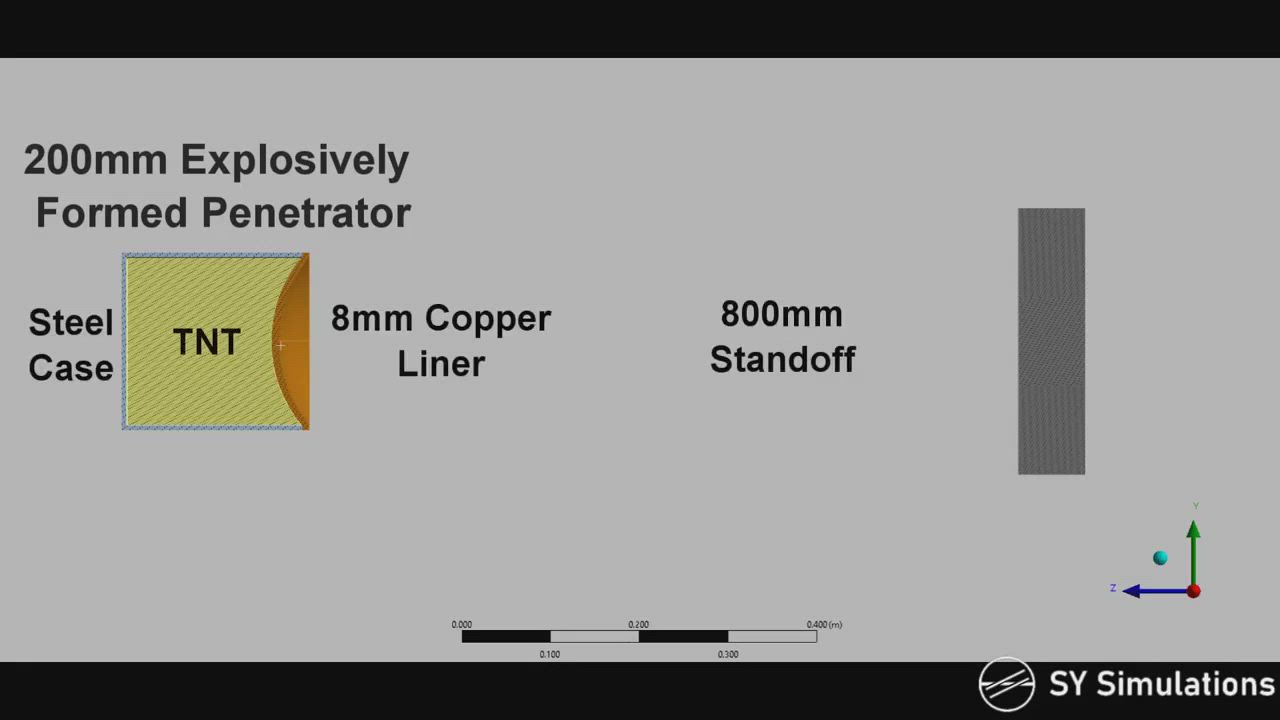 Video simulation on the formation and effects of an explosively formed projectile (EFP) of a shaped-charge with a metal liner.