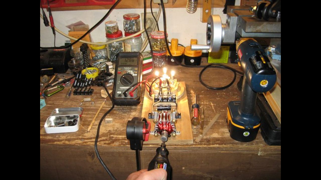 This is my DiaMag7 Alternator. It is a diametrically magnetized alternator that uses a single cylindrical magnet that is one inch in diameter. After studying Tesla Polyphase Alternators I started building some experimental alternators. This one is number 7, and the first to produce some decent results.